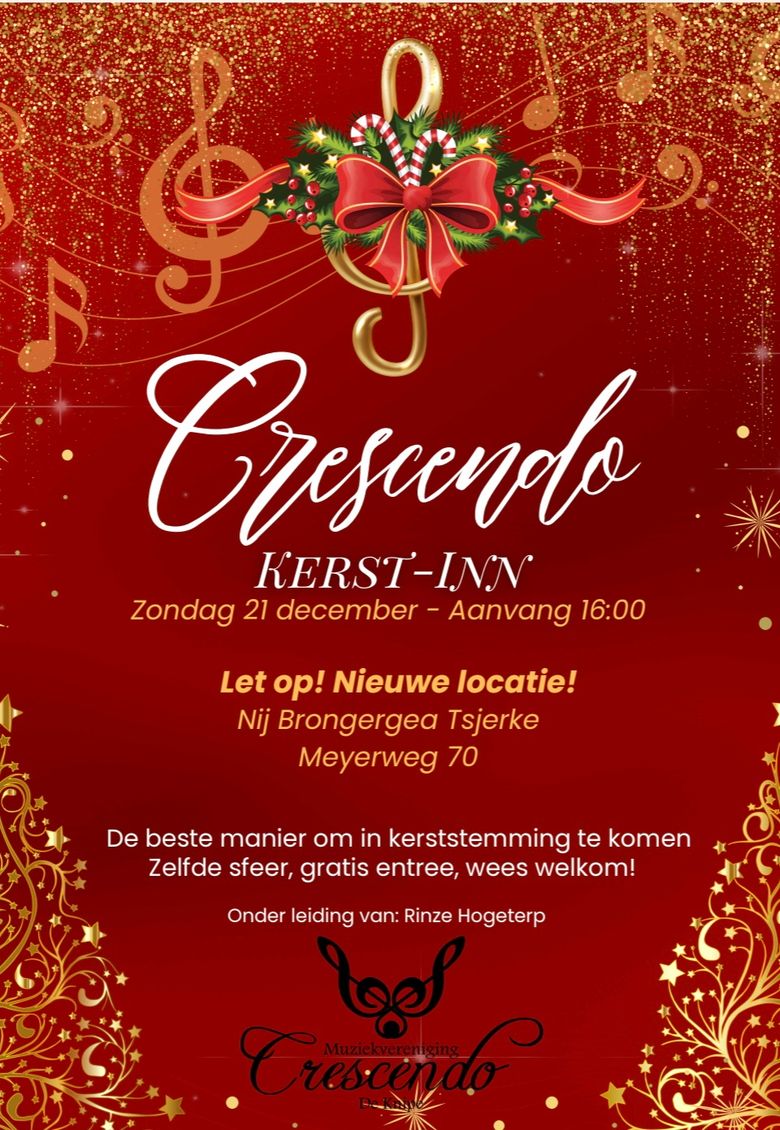 Op 21 december om 16:00 verzorgt Muziekvereniging Crescendo uit de Knipe een feestelijke Kerst-Inn, dit jaar op een nieuwe locatie: