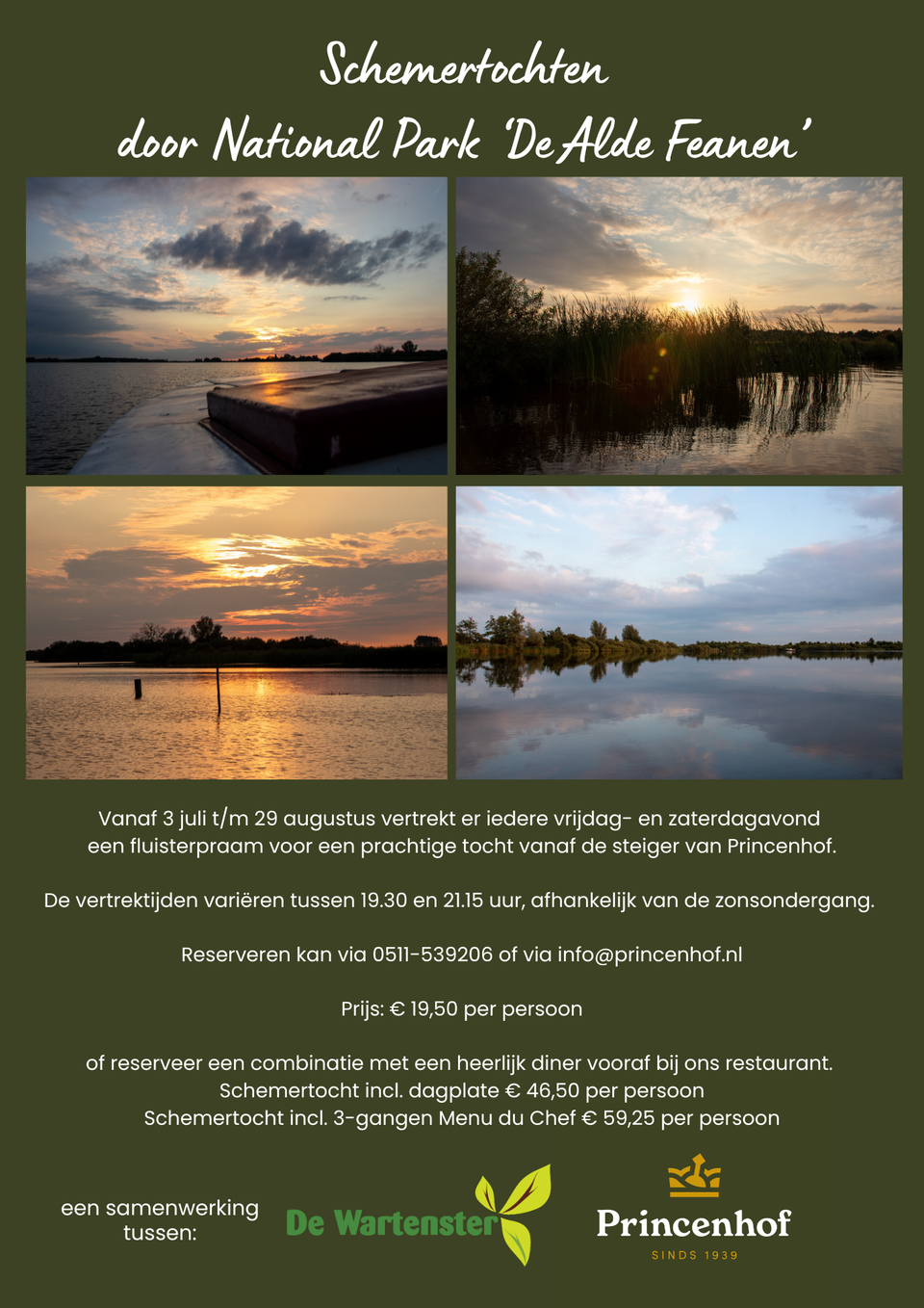 Op 22 & 23 mei en van 3 juli tot en met 29 augustus vertrekt er iedere vrijdag & zaterdag een fluisterpraam vanaf de steiger van Princenhof voor een prachtige schemertocht tijdens zonsondergang. De vertrektijd van de tocht wordt bepaald aan de hand van de zonsondergang en zal ergens tussen 19.30 en 21.15 uur zijn.