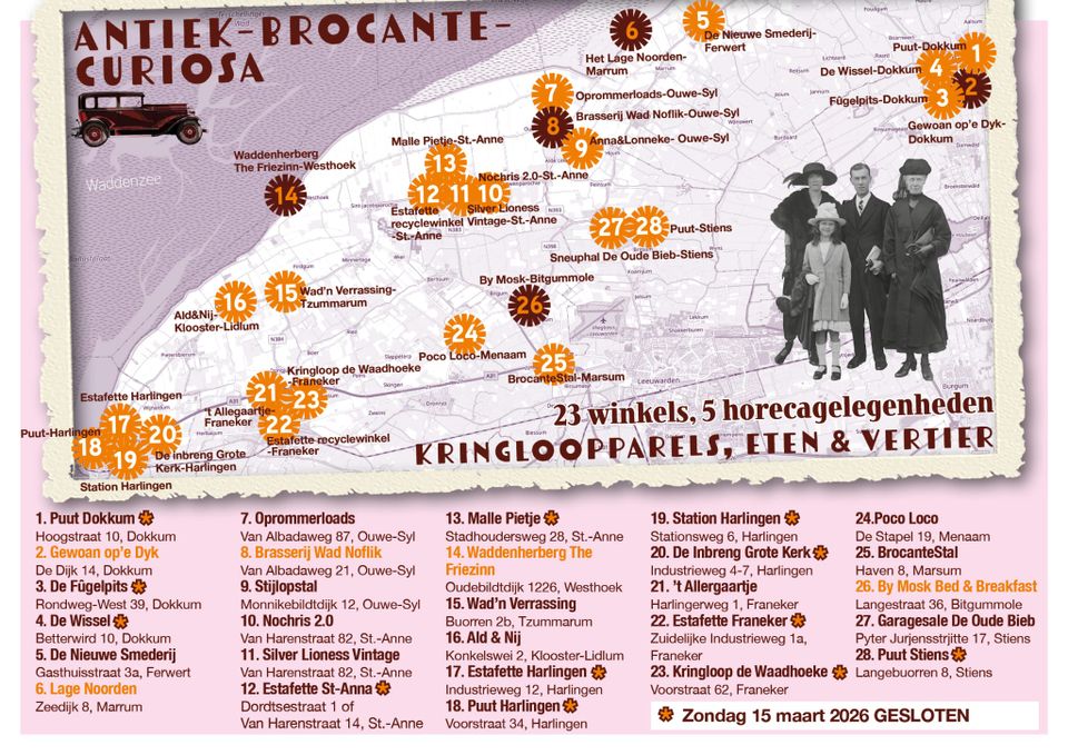 In de voorjaarseditie zijn er ook nieuwe locaties toegevoegd. Met name een aantal bijzondere tweedehands kledingwinkels doen mee. Ook nieuwe deelnemers met brocante haken aan. En er is een nieuw horecapunt gekomen in Bitgummole.