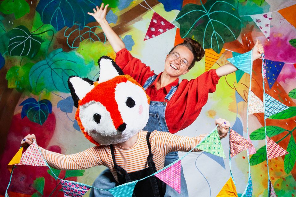 Een feestelijke woordloze maskervoorstelling over jarig zijn naar het gelijknamige prentenboek van Miriam Bos.