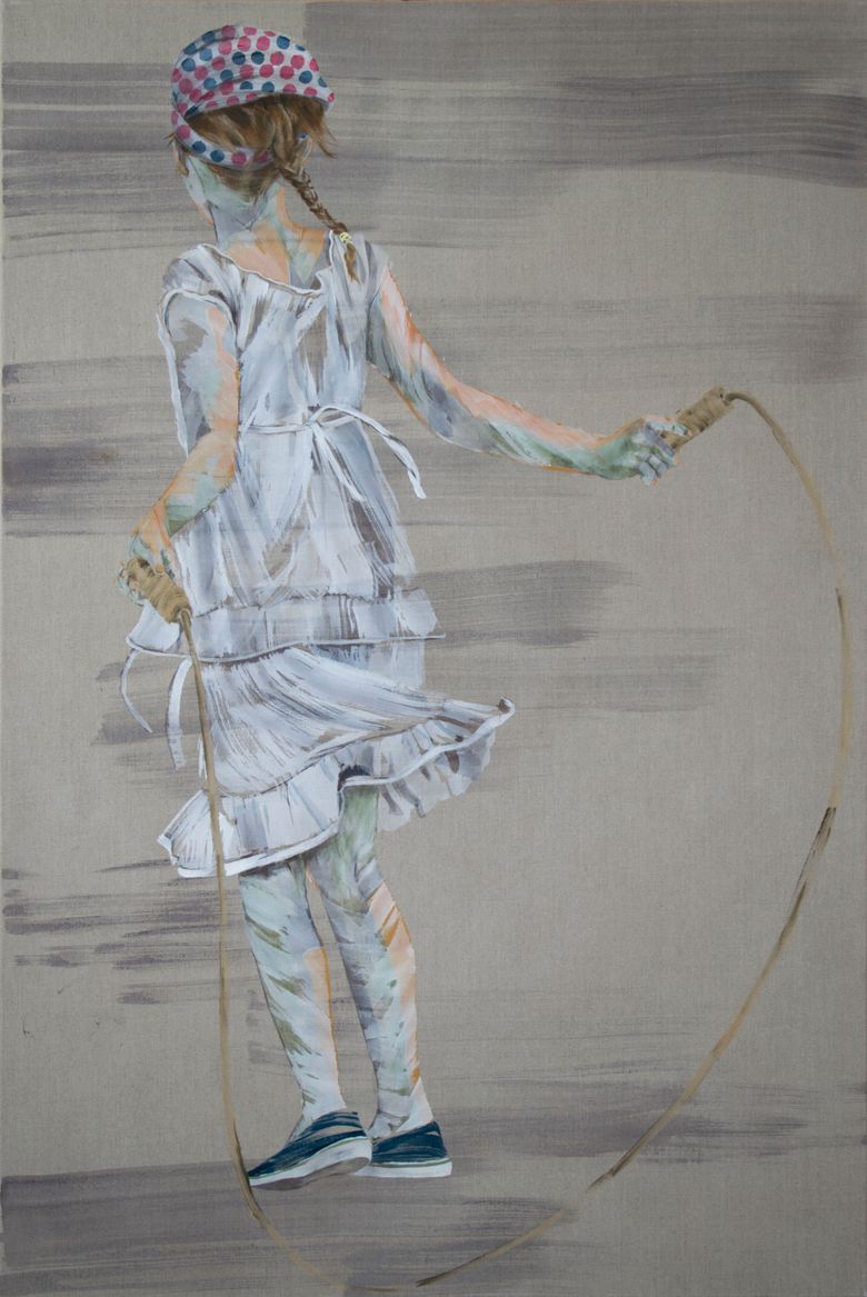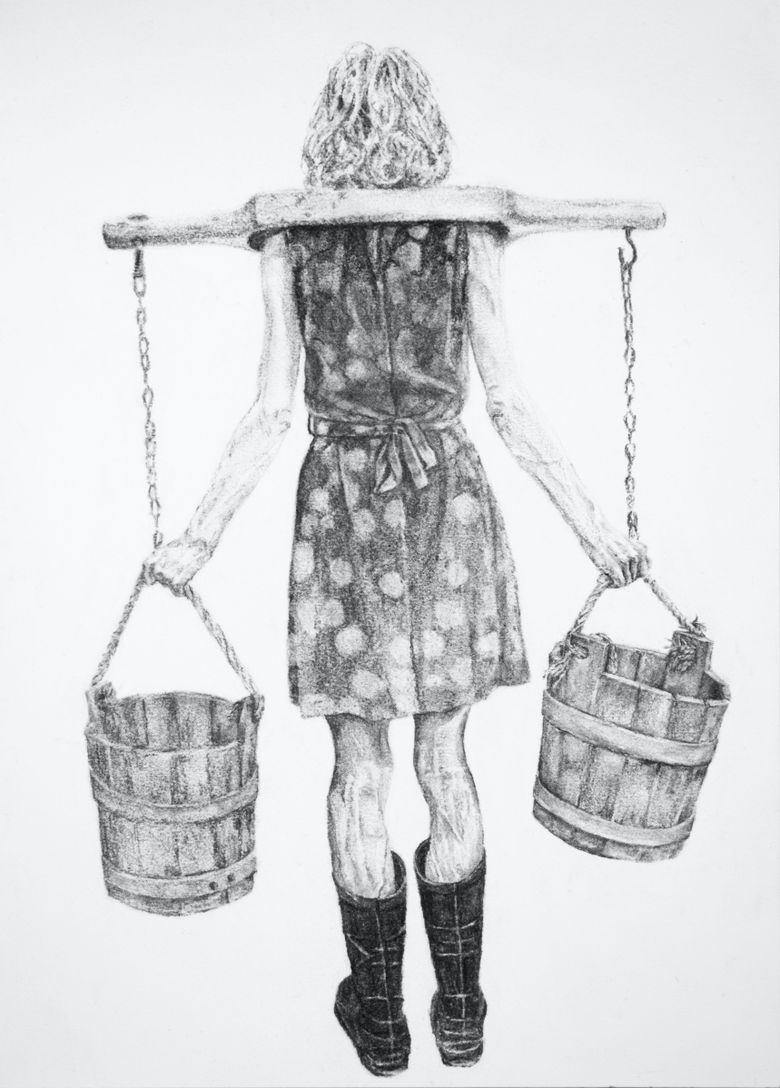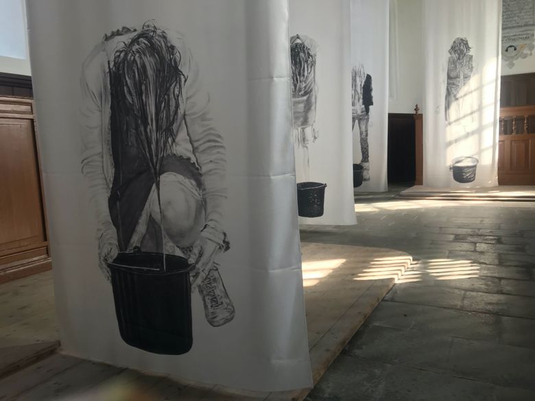 Vijf grote doeken hangen vanaf de balken naar beneden. Op elk doek is een vrouw te zien die zich op haar eigen manier verhoudt tot een emmer water. De oorspronkelijke houtskooltekeningen zijn op stof geprint en vormen samen een verstilde, ruimtelijke compositie.