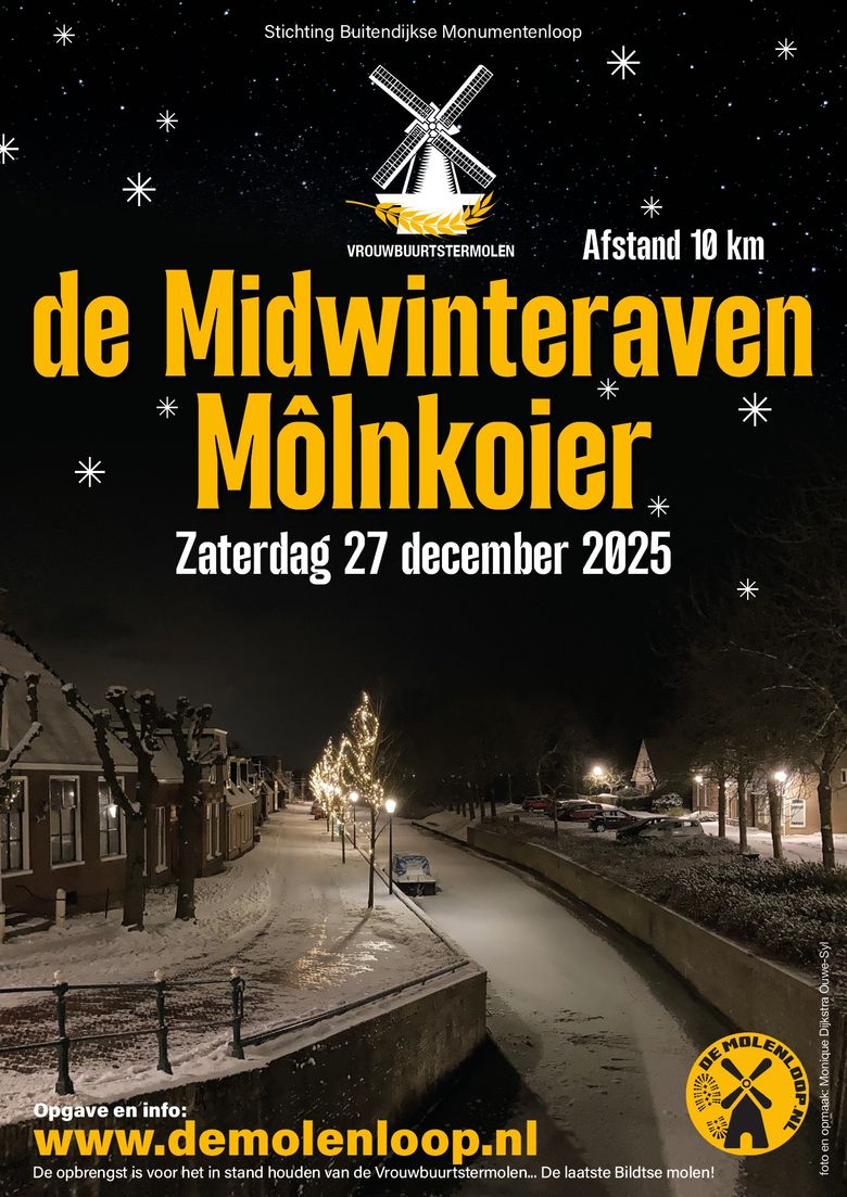 Op zaterdagavond 27 december organiseert Stichting Buitendijkse Molenloop de 9e editie van de Môlnkoier. Dit jaar voor het eerst de wintereditie, een unieke wandeling door het prachtige Bildt.