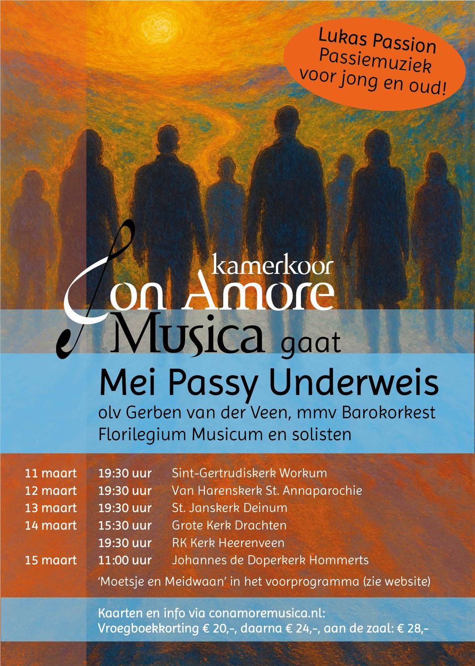 Passiemuziek voor jong en oud! Kamerkoor Con Amore Musica gaat Mei Passy Underweis! Een dorpen- en stedentocht om jong en oud kennis te laten maken met Passiemuziek onder de bezielende leiding van Gerben van der Veen. M.m.v. Barokorkest Florilegium Musicum en solisten.