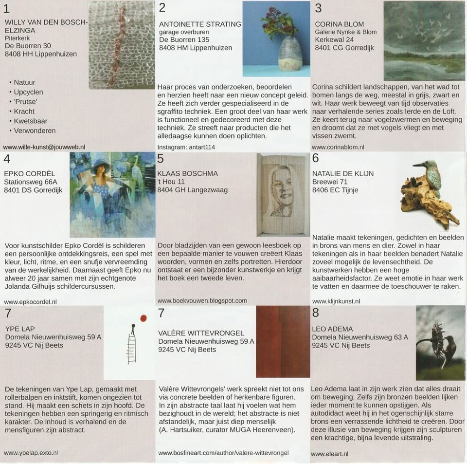 Maak kennis met kunstenaars, die de vele disciplines van hun kunst graag met u delen, door hun atelier open te stellen. De route bevat een grote variatie aan technieken en werkwijzen: keramiek, fotografie, schilderijen, textiel of hout, u hebt een ruime keuze.