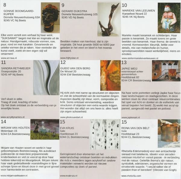Met het openstellen van het atelier krijgen bezoekers een kijkje in de werkruimte. De kunstenaar is aanwezig om eventueel tekst en uitleg te geven. Bij elke kunstenaar kan men een lootje kopen voor € 2,- De winnaar mag een kunstwerk uitzoeken bij een van de deelnemende kunstenaars uit Opsterland tot een maximale waarde van € 200,- Bezoek aan de kunstroute is uiteraard gratis.