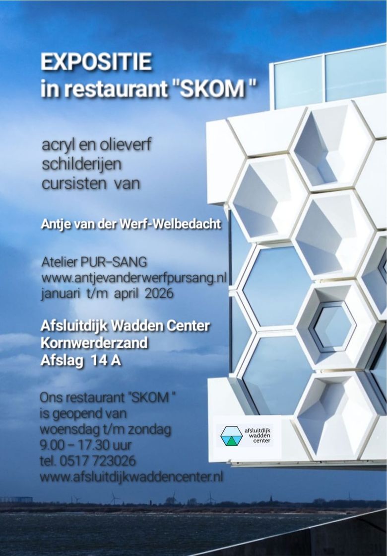 Restaurant "SKOM"- afsluitdijk Wadden Center toont een inspirerende selectie schilderijen van cursisten van Antje van der Werf - Welbedacht. De expositie brengt werken in acryl en olieverf samen die, ieder op een eigen manier, het resultaat zijn van gedrevenheid, experiment en persoonlijke groei binnen het atelier. De tentoonstelling laat zien hoe divers en karaktervol hun werk is, dit jaar staat de expositie in het teken van Friesland, een thema dat zichtbaar terugkomt in onder meer waddenlandschappen, dorpsgezichten en sfeervolle impressies van het Friese buitengebied. De tentoongestelde schilderijen zijn te koop tegen bescheiden prijzen. Daarmee zijn ze niet alleen een aanwinst voor kunstliefhebbers, maar ook originele cadeautips voor elke gelegenheid.