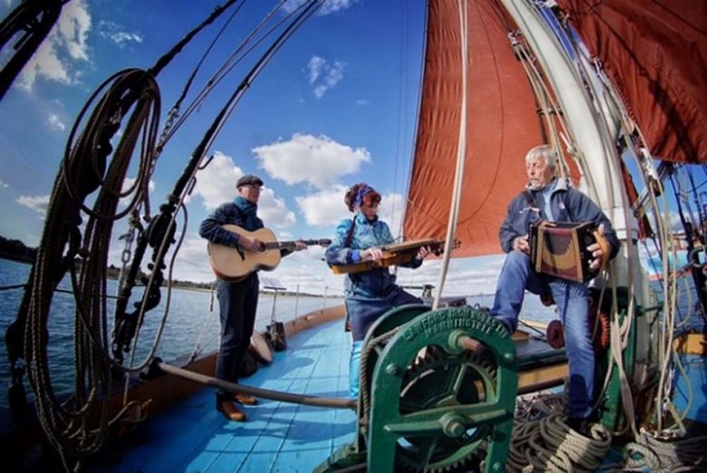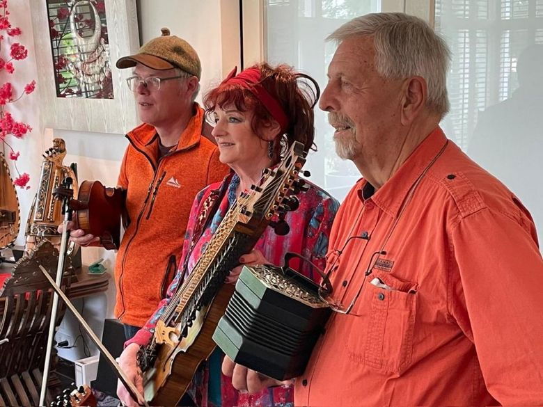 De instrumenten die SEA FEVER gebruikt tijdens hun optreden zijn o.a. gitaar, viool, concertina, nyckelharpa, draailier, trekzak en bones/kleppers.