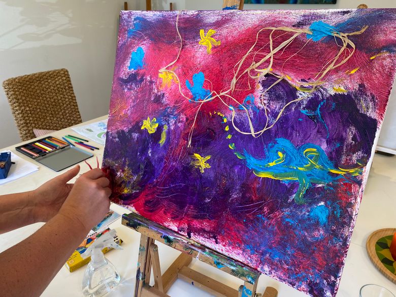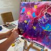 - Daarna ga je intuïtief schilderen vanuit die verbinding. Wat wil door jou heen zichtbaar worden? Welke kleuren, vormen of symbolen horen bij jouw proces?