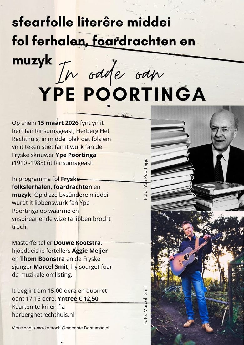 Op zondag 15 maart 2026 vindt in het hart van Rinsumageast, in Herberg Het Rechthuis, een middag plaats die volledig is gewijd is aan het werk van de Friese schrijver Ype Poortinga (1910-1985) uit Rinsumageast.