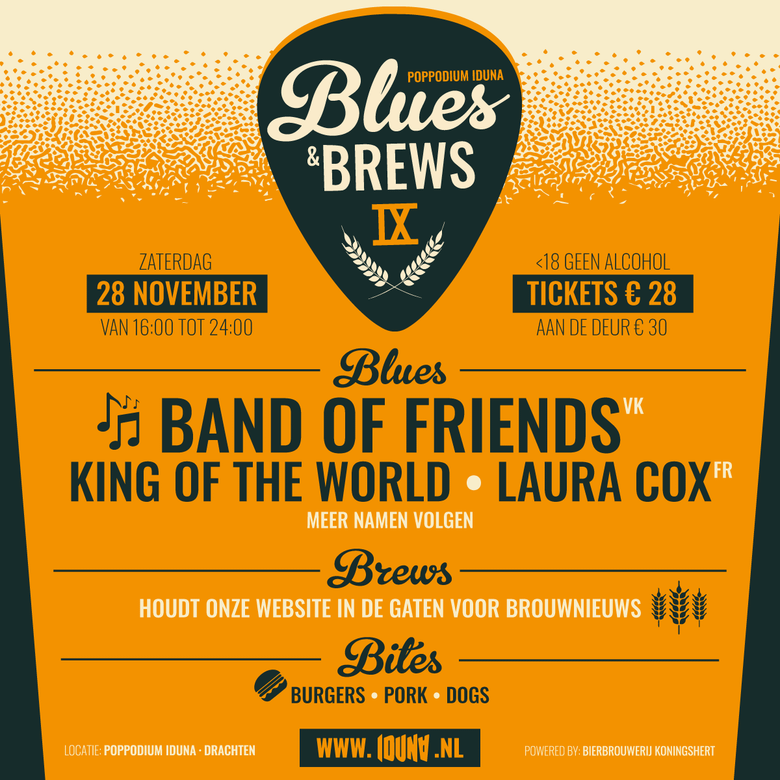 Zet alvast in je agenda: op 28 november 2026 is er weer een gloednieuwe editie van Blues en Brews in Iduna! Een gezellig festival met de beste lokale brouwerijen, geweldige bluesacts en heerlijk bier! Met onder andere Laura Cox en Band Of Friends belooft Blues en Brews IX weer een feest te worden!
