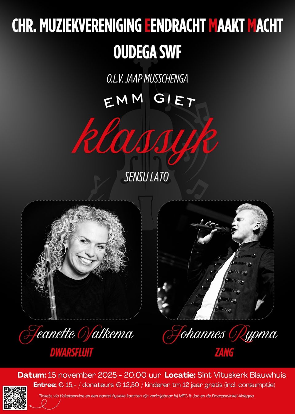 Eindelijk geeft fanfare Eendracht Maakt Macht (EMM) uit Oudega -SWF weer een concert in de mooie Sint Vituskerk van Blauwhuis. Samen met Johannes Rypma (zang) en Jeanette Valkema (dwarsfluit) brengt EMM een afwisselend programma met o.a. Rondo Russo, Finlandia, Mamma Mia, Mars 1488 en nog veel meer. Kom genieten van 'EMM giet Klassyk'!