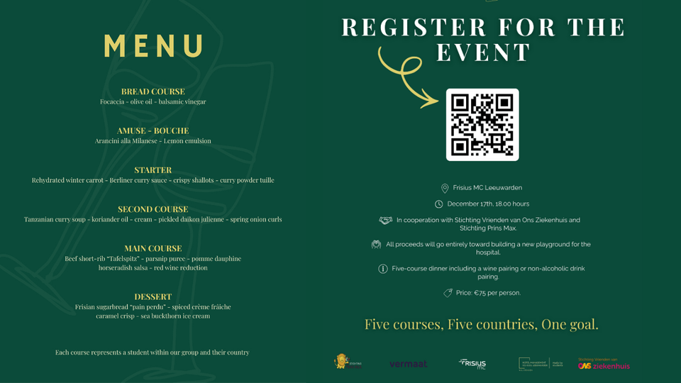 Het doel van het evenement is om geld op te halen voor een nieuwe speeltuin voor de kinderen in het Frisius MC in Leeuwarden. Gasten genieten van een vijfgangendiner op fine-dining niveau, geïnspireerd op vijf landen: Italië, Duitsland, Oostenrijk, Tanzania en Nederland en worden volledig bereid en geserveerd door de studenten. De prijs is €75 per persoon, inclusief wijn- en alcoholvrije arrangementen. De volledige opbrengst gaat rechtstreeks naar het speeltuinproject, waardoor deze avond niet alleen heerlijk, maar ook betekenisvol wordt.