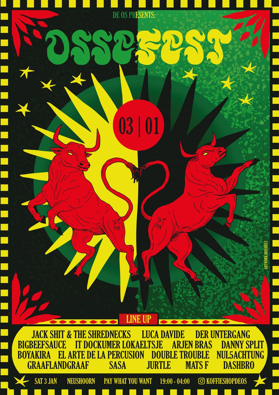 Het feest viert de heropening van het café “De Os”, dat tijdelijk gesloten was, en brengt 16 verschillende bands en artiesten samen, vooral lokale talenten, die tot diep in de nacht optreden. Met een gevarieerd programma vol muziek en een gezellige, informele sfeer is OSSEFEST een perfecte avond voor muziekliefhebbers die willen losgaan en genieten van live-optredens in een intieme setting.