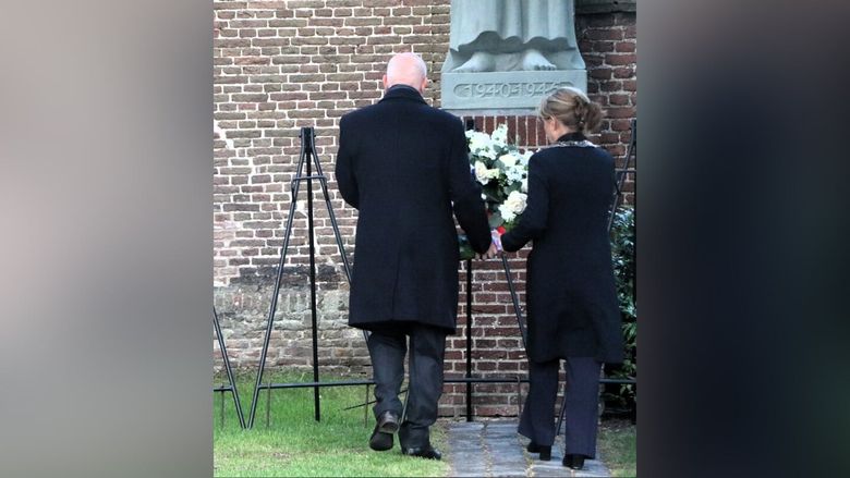 Kranslegging door diverse verenigingen bij het oorlogsmonument in Sneek.