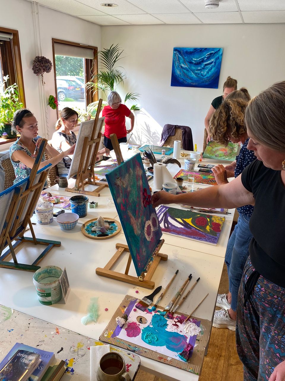 Je hoeft geen schilderervaring te hebben. Het gaat om luisteren naar jezelf, het ritme van je penseel en de beelden die vanzelf ontstaan. Je gaat naar huis met een eigen schilderij én helderheid over wat er in jou geboren wil worden.