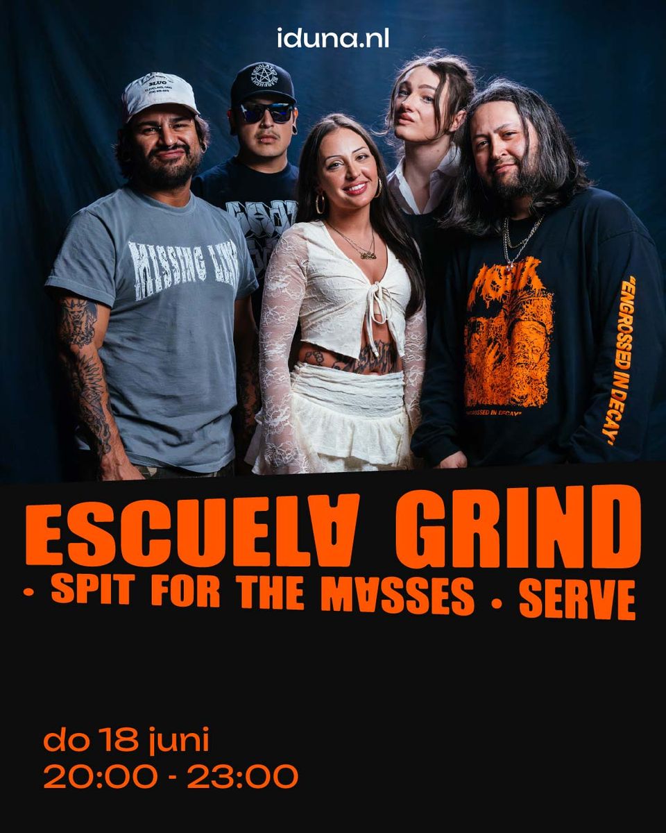 Powerviolence/grindcore outfit Escuela Grind komt naar Iduna! Dit jonge vijftal beukt en scheurt met kneiterharde gitaren, brute vocalen en nul komma nul genade voor je trommelvliezen. Met o.a. elementen van thrash, grindcore, hardcore punk en deathmetal. Voorprogramma: Spit For The Masses en Serve.